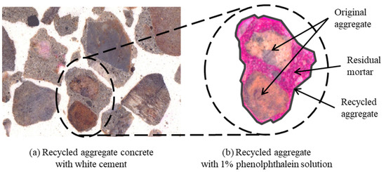 RCA produced from C&D waste is made up of old residual mortar and NA (i.e., original aggregate) (Figure 1). This residual mortar sticks to the original aggregate and is considered a major factor that distinguishes RCA from NA [43]. The presence of the residual mortar lowers densities of the RCA and raises its water absorption capacity, and it contributes to the reduction in the mechanical strength and durability performance of RAC [44,45,46,47].