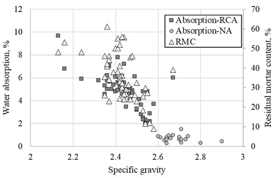 Figure 2 presents the relationship between residual mortar content, water absorption and specific gravity of NA and RCA studied by various research groups. The specific gravity of NA is mostly distributed in the range of 2.6 to 2.8 and the water absorption ratio is less than 2%, whereas, for the RCA, the water absorption ranges between 2% and 8%, and the specific gravity is distributed between about 2.3 and 2.5. A direct comparison of water absorption and density by residual mortar content may not be meaningful, as the original aggregate of the RCA used in each literature is not the same, but it seems clear that the content of residual mortar is inversely proportional to the density of RCA and directly proportional to the water absorption capacity.