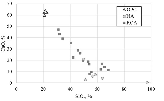 In addition to physical characteristics, RCA differs in chemical composition from NA. Figure 3 shows the relationship of chemical composition between calcium oxide (CaO) and silicon dioxide (SiO2) in ordinary Portland cement, NA and RCA. Since the cement is produced to meet the composition required by standards [73,74], CaO and SiO2 were concentrated at about 62% and 22%, respectively [71,75,76,77]. For NA used in various studies, the amount of SiO2 was in the range of about 50–63%, and CaO was mainly less than 10% [58,75,76,78,79,80]. For RCA, which is a mixture of original aggregate and residual mortar, the SiO2 content was lower and the CaO was higher than those of NA, distributed between ordinary Portland cement and NA [58,75,76,78,79,80,81,82,83].