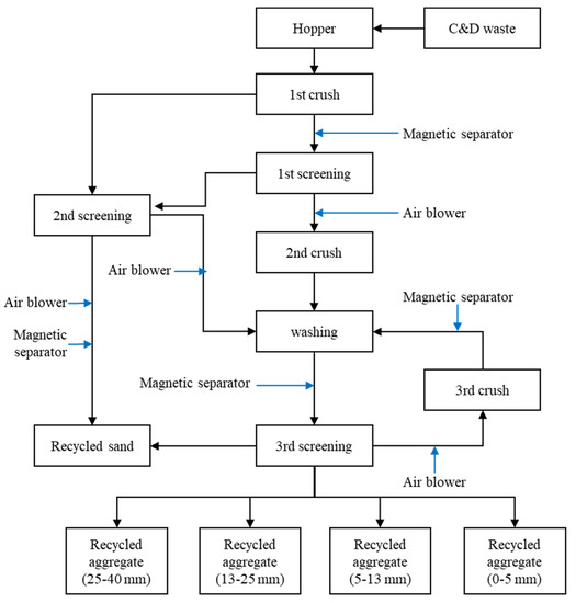 In order to produce RCA with the suitable size as a construction material (0–40 mm) from massive C&D waste, concrete debris must go through a series of essential processes in which mechanical crushing is mainly employed. This basically consists of crushing to obtain size fractions suitable for use; magnetic separation to remove ferrous metals; a separation by air blowers to get rid of the nonmagnetic substance, such as paper, wood, plastic and dust; and screenings to sort the produced RCA by size (Figure 4). The quality of the RCA produced is affected by the type and specification of the recycling facility [84,85].