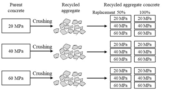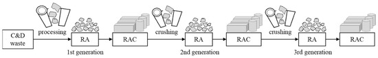 Generally, research on RAC has been focused on concrete made from RCA obtained from NAC. However, some researchers studied the reuse of RCA by investigating the effect of repeatedly reused RCA on the properties of RAC. The scheme of repeated use of RCA is shown in Figure 8.