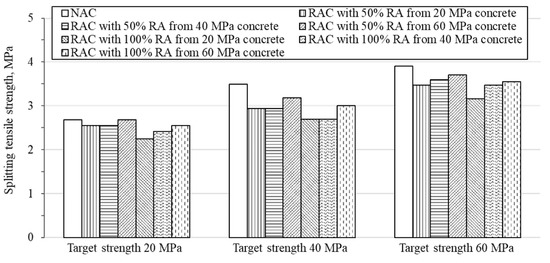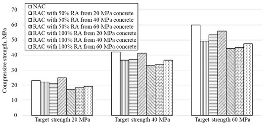 Ahmad Bhat [104] produced low-, medium- and high-strength RCAs by crushing parent concretes with different compressive strengths of 20 MPa, 40 MPa, and 60 MPa, respectively. Using the three RCAs produced, a total of 18 series of RACs were manufactured: 6 series of RAC with target strengths of 20, 40 and 60 MPa at 50% and 100% replacement ratios using RCA obtained from the 20 MPa parent concrete; 6 series of RAC with target strengths of 20, 40 and 60 MPa at 50% and 100% replacement ratios using RCA obtained from 40 MPa parent concrete; another 6 series of RAC with target strengths of 20, 40 and 60 MPa at 50% and 100% replacement ratios using RCA obtained from 60 MPa parent concrete (Figure 5). The compressive strength of the low strength concrete with 50% RCA replacement obtained from high-strength concrete was 9% higher than that of parent concrete, and the tensile strength was the same as that of parent concrete with NA (Figure 6 and Figure 7). A similar result was noted that RCA obtained from high strength parent concrete can achieve a similar compressive and tensile strength to normal strength concrete with NA [105]. In addition, as frequently observed in other studies [106,107], RAC with 100% RCA replacement showed lower mechanical strength than RAC with 50% RCA replacement. Considering the lower physical performance of RCA compared to NA, it is an expected result, and, the relationship between the strength of the parent concrete and the strength of the next generation concrete is also observed.