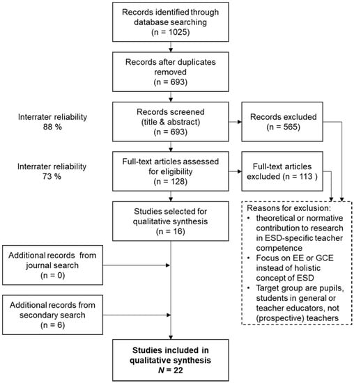 The authors followed the preferred reporting items for systematic reviews and meta-analyses (PRISMA-P) guidelines [54]. The database search revealed 1025 records. In accordance with the PRISMA procedures, 332 duplicate papers were removed. Non-duplicated papers were then processed in several steps. First, titles and abstracts were screened pertaining to the inclusion and exclusion criteria by two independent reviewers. Second, full texts were obtained for records that met the basic inclusion criteria and these were read thoroughly and deemed either suitable or unsuitable according to the inclusion and exclusion criteria by two independent reviewers. In both steps, any discrepancies between reviewers were resolved by consensus. Records were kept of this process, with 88% agreement prior to discussion and 100% post discussion for the screening of titles and abstracts and with 73% agreement prior to discussion and 100% post discussion for the full-text analysis. After conducting the database search, a secondary manual search was conducted. The Journal of Teacher Education for Sustainability was searched in the years 2018–2020 to doublecheck the database search. This search did not reveal any new publications that met the eligibility criteria. Additionally, a manual search in the reference lists of publications obtained through the database search was conducted and revealed another six relevant papers. During the data analyzing process, the research team performed the following roles: main analyst (J.L.), coanalysts (J.B., H.K., M.W.) and critical colleagues (H.P.B.-B., U.O., P.G.-S.). After this process, a total of 22 papers from 2008 onwards were included in the review (see Figure 1).