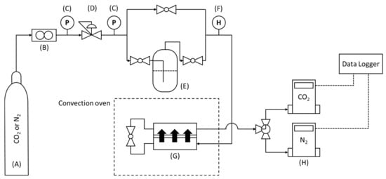 Schematic diagram of the polymer membrane separation system. (A) N2 or CO2, (B) floating flow controller, (C) pressure gauge, (D) precision regulator, (E) humidifier, (F) temperature and humidity meter, (G) membrane separation system, and (H) mass flow meter.