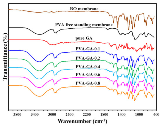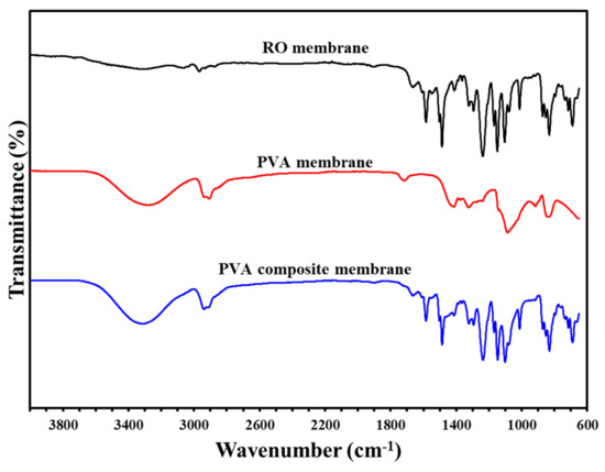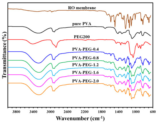 A mixed solution of polyvinyl alcohol and polyethylene glycol was coated on the reverse osmosis membrane to prepare a composite membrane. ATR-FTIR was used to analyze the resulting materials; results are shown in Figure 6. The characteristic absorption features of the reverse osmosis membrane are observed, confirming that the coating is thin enough to allow infrared light to penetrate the selection layer to the reverse osmosis membrane. The strength of the absorption line at 1090 cm−1 is dependent on the amount of polyglycol in the sample.