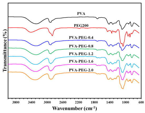 A fixed amount of polyvinyl alcohol was mixed with different volumes of polyethylene glycol and applied to a self-supporting membrane. The resulting materials were analyzed using ATR-FTIR; results are shown in Figure 5. The main absorption peaks of polyethylene glycol are C-H and C-O stretching vibrations at 2800–2900, and 1350 and 1090 cm−1, respectively. From the spectrum, it is observed that increasing the polyglycol addition results in strengthening of the absorption features associated with polyethylene glycol. This is especially evident for C-H and C-O stretching vibrations at 2800–2900 and 1090 cm−1, respectively.