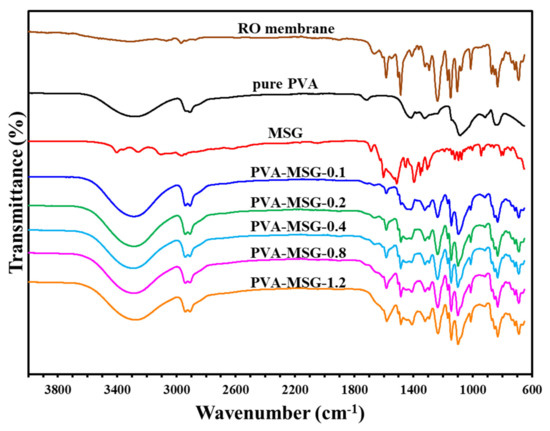 Polyvinyl alcohol is mixed with monosodium glutamate and coated in a reverse osmosis membrane to form a composite membrane; its infrared spectra are shown as Figure 8. Compared with the original reverse osmosis membrane, the composite membrane spectrum displays polyvinyl alcohol absorption lines, and the sodium glutamate C-O stretching vibration of 1602 cm−1. Penetration also decreased with an increase in the content of sodium glutamate, and from another C-O stretching vibration at 1395 cm−1, it can be seen that the absorption peak becomes more obvious, representing an increase in the MSG content in the selection layer.