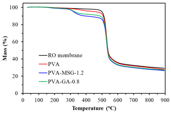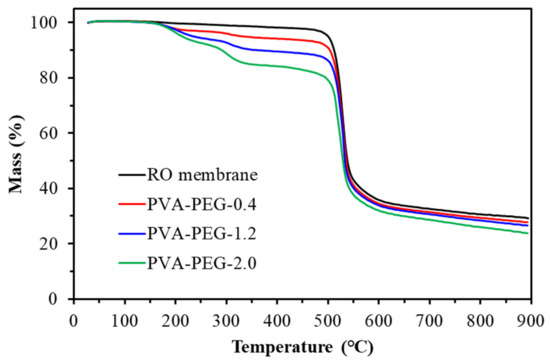 To avoid a weight increase associated with increased thickness of the support material, the polyester support layer in the composite membrane is torn off, leaving only three layers of mixed polymer, polyamide and polyurethane. The thermal stability of the composite membrane is tested under an argon atmosphere with a temperature ramp increasing to 900 °C. Polyvinyl alcohol (PVA)-polyglycol (PEG) composite membrane thermal stability experimental results are shown in Figure 10 and Table 4. It is observed that the reverse osmosis membrane as a substrate has a significant weight loss only at 500–550 °C, which should be associated with the polysulfone that acts as a support layer. The composite membrane coated with PVA-PEG shows three stages of weight change. The first stage weight change at 150–250 °C comes from the loss of composite membrane moisture and PEG cracking, the second stage at 275–350 °C comes from PVA cracking, and the third stage at 500–550 °C is the same as the reverse osmosis membrane which is caused by PSU lysis. The experimental results of the polyvinyl alcohol-glutamic acid (salt) composite membrane thermal analysis are shown in Figure 11. In addition to PSU cracking, a weight change can be seen at 275–375 °C. From Figure 12, the maximum cleavage rate temperatures of glutamic acid (salt) and PVA are approximately 300–400 °C, so this temperature change should be as a result of the degradation of glutamate acid and PVA.