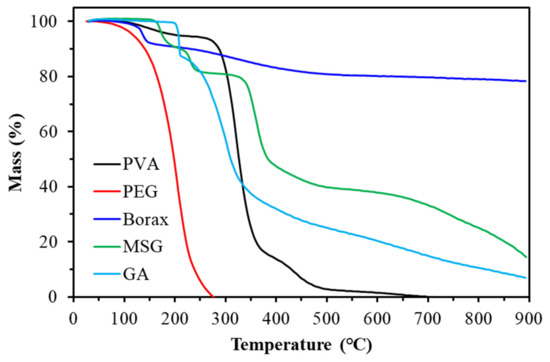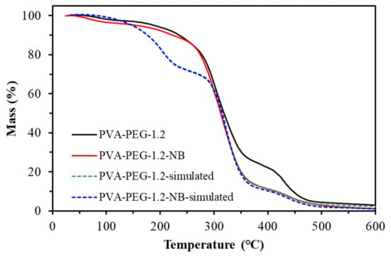 Simulation results of a linear addition of thermal weight changes in each component are shown in Figure 23. It can be seen that PVA-PEG produced significant weight changes in three stages. These occurred at approximately 125 °C, 200–350 °C and 375–450 °C, corresponding to moisture loss, lysis of polyglycol and polyvinyl alcohol branch chains, and cracking of polyvinyl alcohol main chains, respectively [25,34,35,36].