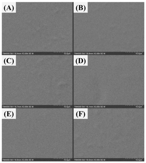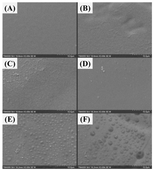 There are two reasons for the decrease in water absorption associated with the addition of sodium glutamate. Firstly, because the water absorptivity of sodium glutamate is less than that of polyvinyl alcohol, the addition of sodium glutamate results in an overall decrease in water absorptivity. Secondly, as observed via SEM analysis, sodium glutamate forms particles on the surface of the membrane, thus reducing the contact area between the membrane and moisture in the space. This results in a decrease in water absorption of the PVA-MSG-0.8 membrane over the same period.