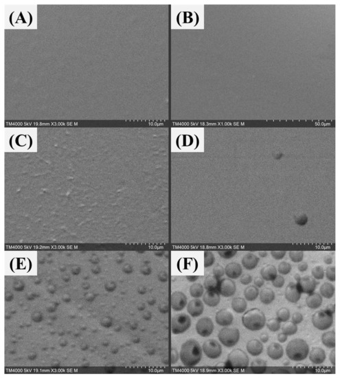 SEM was used to observe the membrane surface pattern and showed that the polyamide layer distribution as a substrate had many holes, as shown in Figure 13A. When the composite membrane surface is coated with a polyvinyl alcohol solution (PVA-B-2), the original rough surface is covered by PVA and converted to a dense surface as shown in Figure 13B.