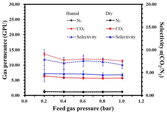 Compared with the membrane after the solution diffusion mechanism, the promotion of the transmission mechanism contributes to high CO2 separation and CO2/N2 selectivity. In convenient transport, the CO2 separation capacity of a mobile carrier is higher than that of a fixed carrier, but lacks carrier stability [14]. Polyallylamine (PAA) is one of the fixed carriers used for CO2 separation and is mixed with other polymers, either without change or in the form of bit resistance [15,16,17,18,19,20,21]. PAA is primarily amine-based, which is very fragile and cannot form a membrane under dry conditions. The polyvinyl alcohol (PVA), in combination with PAA, is widely used as a fixed position in CO2 substrates and mixing bases [18]. Temperature and humidity influence the transport mechanism. PVA is soluble in water and at higher humidity a decrease in CO2 emission performance may be observed at temperatures lower than 70 °C [15].