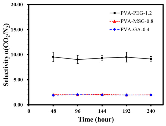 In this experiment, the highest CO2 selectivity sample of each group, namely PVA-PEG-1.2, PVA-MSG-0.8 and PVA-GA-0.4 composite membrane, were teste. CO2 selectivity for each material was tested after 48, 96, 144, 192, and 240 h to determine whether the composite membrane has deteriorated over the 10-day period. Experimental results are shown in Figure 22 and Table 12.