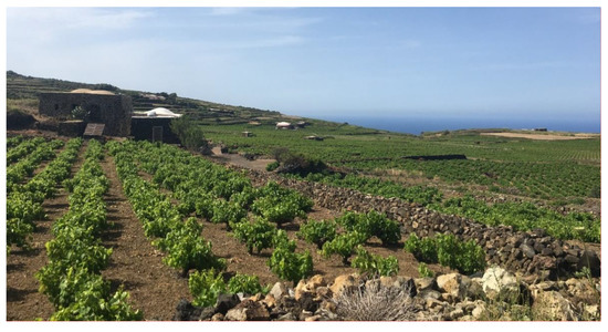 The island’s peculiar geomorphology due to its volcanic origin, as well as local micro-climates favourable to endemic species of great value, are features of utmost interest [1]. In turn, rural landscapes have been shaped from the sea level up to the higher altitudes, taking hold of even the steepest slopes. As a matter of fact, terrace systems have been around since the protohistoric age: continuity over time of such settlement patterns embedding formal, functional and symbolic values conveys the idea of a human-nature balance achieved at great sacrifice [35,36,37,38]. Rural landscape encompasses several types of centuries old artefacts erected in local lava stone evidencing the hardships of peasants’ lives, including steepness (terrace systems), droughts (storing water devices) and extreme windiness (pits up to 80 centimetres deep for protecting crops). Using and handing down specific cultivation techniques, the community of Pantelleria has modelled on the lava and available lands an agricultural mosaic of traditional non-irrigated crops protected by dry stone walls and terraces “of extraordinary aesthetic charm and great scenic impact” covering more than 70% of the entire island [39,40,41,42].