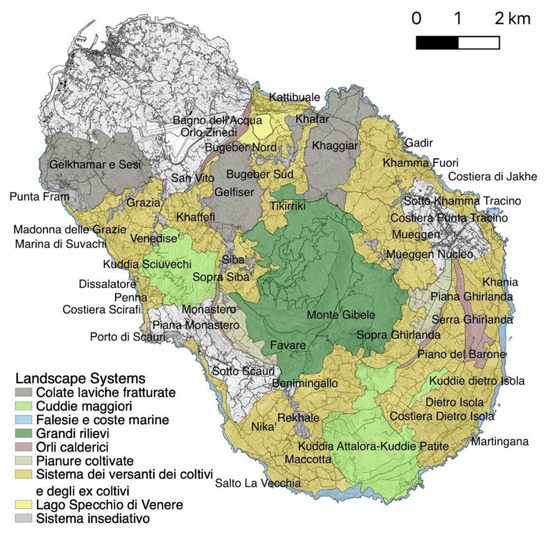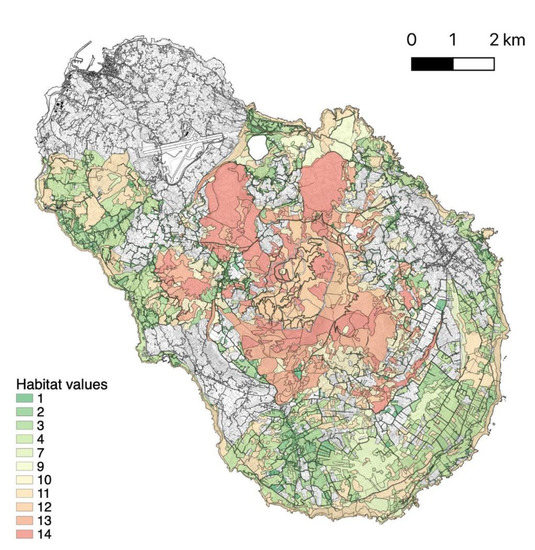 The spatial complexity of the agro-ecological mosaic, due to the intrinsic features linked to the geological conformation of the island and the extreme variability of its microclimate, confers a high ecological and perceptive value [69]. However, abandonment phenomena started after the Second World War, due both to morphology and land fragmentation, forbidding the introduction of mechanization in agriculture. Consequentially, spontaneous vegetation occupied previous crop areas, mainly at high altitudes [70,71,72].