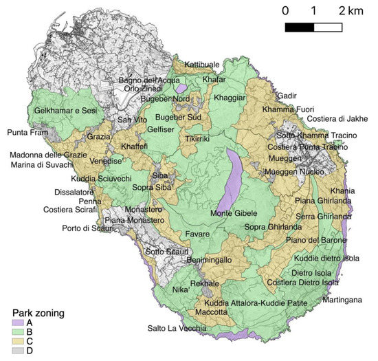 After these evaluations, modifying the zoning of the Pantelleria National Park introduced by the DPR 28.07.2016, a new division of 4 zones was provided for the Park Plan (Figure 10):
