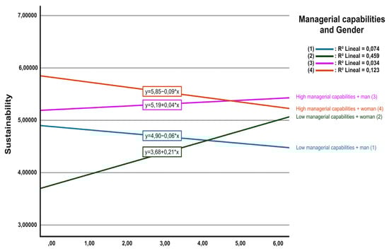 Similarly, the results support Hypothesis 4, which posits that being a woman with a high level of managerial capabilities significantly and positively moderates the influence of technology use on sustainability. Higher educational attainment or knowledge boosts people’s confidence when approaching different innovations [101] and reduces women’s difficulties with the use of technology for achieving sustainability. In this case, the impact that managerial capabilities have on women compared to men is particularly relevant. This is consistent with women’s relationship with technology, analysed in the previous hypothesis. In this respect, the graph indicates that women with a high level of managerial capabilities are able to make better use of technology to achieve greater sustainability; however, as the number of technologies increases, their ability to manage these technologies in an effort to achieve sustainability decreases. In the case of men, they are generally better at managing more complex technology but less focused on using it to improve sustainability.