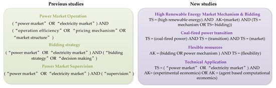 This review has searched for both previous studies of the power market and new studies that show how research is adapting to the NPS, focusing on the research objectives and main research questions. Older studies on the power market were searched for with three groups of strings, including “power marker operation”, “bidding strategy” and “power market supervision”. New studies were searched for with four groups of strings with terms that include “high renewable energy”, “coal-fired power units”, “flexible resources” and “technical application”. The search criteria groups are shown in Figure 2.