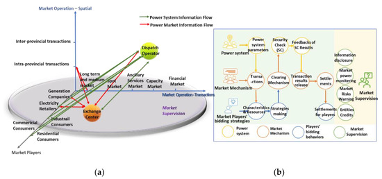 A power market is a complex economic system, with branches forming where the system couples with others. To simplify this study, we built a framework with three dimensions, including market operations, market player strategies and market supervision, to outline a basic paradigm for power market research under the new situation. As shown in Figure 5a, the power market operates through the interaction of different sub-markets. Depending on its different functions, transaction times and spaces, the power market can also be divided into different submarkets. Market players make strategic decisions in different scenarios based on the market mechanisms, which leads to diverse market results. The interaction between market participants and the market operation mechanisms affects the health of the power market. Connecting all kinds of market players, the power trading center is responsible for publishing market information, organizing transactions of different types, managing the credit of market participants and assessing market risk. The dispatch center checks the safety of the power system according to the clearing information of the trading center, and forms the final clearing and dispatch orders. The market supervision department supervises the credit of market players, information disclosure, market force detection and risk warning. As shown in Figure 5b, the power system, market mechanisms and strategies of market participants are key factors that help us understand market systems. These three aspects will be further discussed in the following part of this paper.