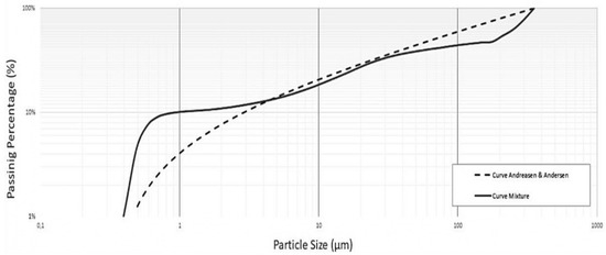 Particle size distribution curve of the UHPC studied in relation to the Andreasen–Andersen curve.