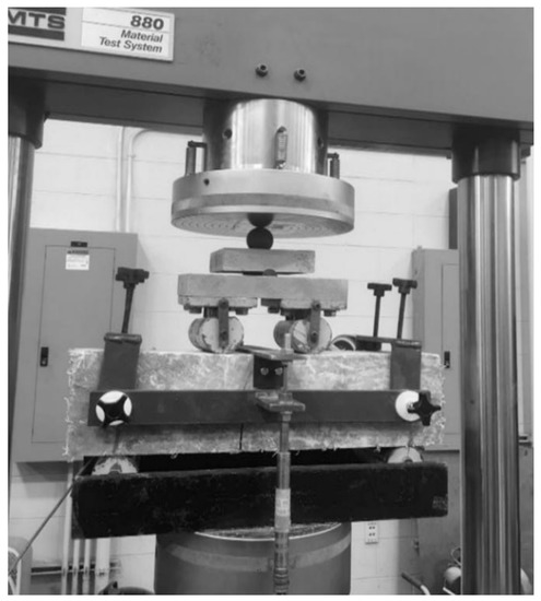 A total of 3 cylindrical specimens measuring 50 × 100 mm were tested for axial compressive strength at 7 and 28 days. An Instron press was used to conduct this test at a loading rate of 0.45 MPa/s. The average of 3 specimens is reported. The flexural performance was determined according to [35] using a closed-loop system with controlled displacement of 0.002 mm/s. A universal electronic hydraulic testing machine with a capacity of 2 MN was used. UHPC prisms measuring 100 × 100 × 350 mm were loaded using 2 cleavers positioned on the middle third span of the specimen, as shown in Figure 2. The flexural load–displacement curve was recorded using 2 embedded linear variable differential transformers (LVDT) placed on both sides of the specimen. Two prisms per test were used for each level of fiber content. Flexural strength was calculated and 2 residual strengths of f100;0.50 and f100;2.0 at vertical displacements of 0.50 and 2.0 mm, respectively, were found.