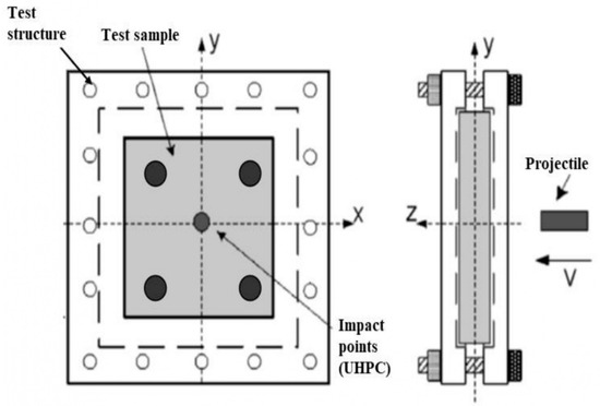 The instrumentation for the impact tests counted with a special pin attached to the side and the base of each element to avoid tipping and other instabilities. Considering the steel frame and the cementitious sample, the stresses were absorbed only by the element. Thus, the sample was subjected to the impact of projectiles with known velocities on 5 points per element, as depicted in Figure 4. All tests were performed on UHPC specimens at 28 days, according to the requirements of [40,41]. Each plate was analyzed by measuring the depth of perforation made by the impact and the diameter of entry and exit of the projectile. The ballistic protective materials covered by [42] are classified into many types by level of performance, and these levels are indicated in Table 5.
