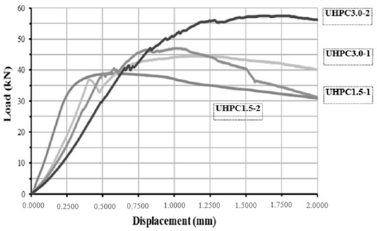 Figure 5 shows the flexural load–displacement curves of UHPC1.5 and UHPC3.0 specimens. The flexural load increased linearly with the increase in deflection up to approximately 0.5 mm. The load then increased non-lineally with deflection at a decreasing slope, and the specimens started to show multiple cracks. After its peak load, the load gradually decreased with deflection. The UHPC3.0 mixture exhibited greater peak load and energy dissipation (which is considered as the area under the load–displacement curve) as compared to the UHPC 1.5 mixture.