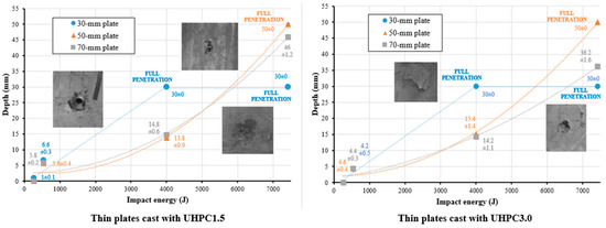 The elements measuring 70 mm in thickness behaved in a similar way to those with thickness of 50 mm. Contrary to the 30- and 50-mm-thick elements, the projectile pass-through did not take place at any of the tested impact energies. For the UHPC1.5 specimens, the projectiles attained a depth of 45 mm. As for UHPC3.0, the depth was of 35 mm, which corresponds to 50% of the element’s thickness. By doubling the fiber volume reinforcement to 3.0%, it was possible to reduce the damage caused by the 7.62 mm caliber bullet by 23%.