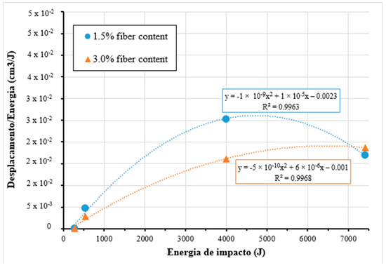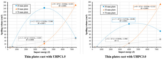 Figure 8 depicts the unit values and the efficiency of both fiber volume ratios with regard to the spalling/impact energy function. Differences in performance can be noted up to an energy level of 4000 J. These differences can reach up to 40% between the UHPC1.5 and UHPC3.0 mixtures. Thus, the viability of adding more reinforcement to reach better performance was assessed. The increased fiber ratio seemed to be inefficient at high energy levels. Therefore, the elements’ geometric characteristics (thickness) should be prioritized, as depicted in Figure 7.
