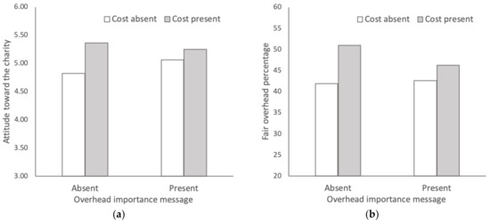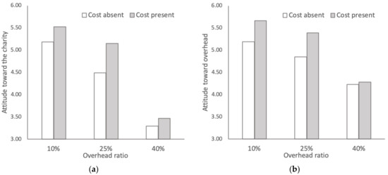 A 3 (overhead ratio) × 2 (cost information) analysis of covariance (ANCOVA) on the attitude toward the charity was conducted, and the participant’s donation experience was included as a covariate (F(1, 355) = 5.23, p = 0.019). The result revealed that the main effects of overhead ratio (F(2, 355) = 43.52, p < 0.001) and cost information (F(1, 355) = 5.69, p = 0.018) were significant. In addition, the interaction between overhead ratio and cost information was not significant (F(2, 355) = 0.95, p = 0.389). The significant main effect of the overhead ratio showed that the evaluation of the charity was more favorable as the charity’s overhead ratio was lower (M10% = 5.35 vs. M25% = 4.82 vs. M40% = 3.38), with all differences being significant (p < 0.004). This result was consistent with the overhead aversion phenomenon. The significant main effect of the cost information yielded that the attitude toward the charity was more favorable when the cost information was present (M = 4.71) than absent (M = 4.32). This result supported H1.
