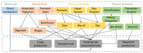 Four main types of technologies can treat biowaste: (a) direct use (e.g., direct combustion); (b) biochemical treatment (e.g., fermentation and anaerobic digestion); (c) physicochemical treatment (e.g., transesterification); and (d) thermochemical treatment (e.g., gasification) [20]. Figure 1 shows that some treatment technologies recover bioenergy among their products—the so-called “waste-to-energy” (WtE) technologies. WtE options address two global challenges simultaneously: the growing amount of waste, as well as the increasing energy demand, providing a clean energy alternative to replace fossil fuel use. They contribute to ‘cleaning’ and diversifying the energy mix and reducing reliance on external energy imports towards resilient energy systems [21]. In addition, some WtE technologies provide opportunities to recover nutrients and close loops in bioresource management [22].