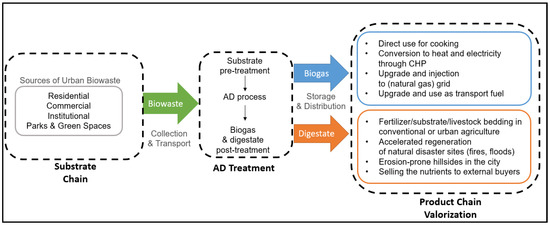 Figure 2 depicts the AD process chain in the urban biowaste recovery context. As shown, the process chain comprises three key stages: the substrate chain, AD treatment, and the product chain. At the substrate chain stage, various urban sources generate biowaste. Urban biowaste is collected and transported for treatment. Pretreatment can enhance substrate quality. Then, the substrate undergoes treatment (i.e., hydrolysis, acidogenesis, acetogenesis, and methanogenesis) through a suitable AD technology. Biogas and digestate products can undergo post-treatment, depending on the intended product use (e.g., biogas upgrade to biomethane and use as transport fuel). Finally, the end products are stored and distributed for valorization at suitable outlets [32].