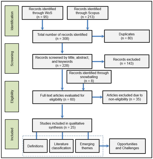To screen the remaining (unique) documents, a series of eligibility criteria were set (see Table 1). In the first screening round, the eligibility criteria were applied by reading the title, abstract, and keywords of each document. In the second screening round, each document was read in full to determine eligibility based on the same criteria. Several papers were excluded based on the second criterion: while they addressed AD for urban biowaste, they often focused on AD at the plant scale and technical/operational aspects of the AD process. In addition, ‘snowball sampling’ [49] was also applied: some studies identified through database search cited or were cited by papers relevant to the review criteria (screening stage, see Figure 3). A final list of 25 records (20 original research articles and 5 review articles) was compiled to conduct qualitative synthesis. Twenty additional references from the wider scientific literature were cited to provide background to the analysis, where appropriate (e.g., [50]).
