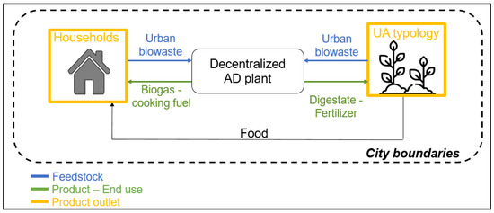 Decentralized AD can enable local circularity or ‘local valorization loops’ by minimizing distances along stages of the value chain [54]. Contrary to centralized approaches, in decentralized systems, waste is treated closer to the source and end users, and thus recovery products can find local end uses, adding value to the urban environment. Figure 4 provides an example in which decentralized AD contributes to a local valorization loop: biowaste is collected from sources such as households and UA and treated through decentralized AD. Biogas produced can be used by the households; e.g., as cooking fuel, and digestate as fertilizer in UA.