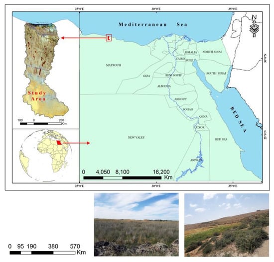 The study area is located in the western part of Matrouh Governorate, Egypt. The studied area, Wadi Al-Halaazin located between longitudes 26°49′58.0″ to 26°58′06″ E and latitudes 31°13′07″ to 31°26′36″ N with total area 21369.74 ha (Figure 1). The international coastal road passes in the middle of it. Arid climate prevails in the study area as the average temperature reaches 18 °C in the winter and autumn but ranged from 18 °C to 25 °C in the summer. The range of rainfall is between 100 and 200 mm/year. In the winter and spring seasons, the vegetation cover changing due to rainfall is active and the natural vegetation spreads within study area, particularly in the wadis and streams in addition, the natural vegetation growth during the autumn and summer seasons because of the natural vegetation spreads on the fine sand stacks that keep rainwater [31] and barley is the main crop in the study area in addition small areas of some scattered olive trees (Figure 1 and Figure 2). In the investigated area, the main geological units are Miocene and Quaternary deposits according to Ministry of Industry and Mineral Resources (MIMIR) [34] (Figure S1). The range of elevation is between 11 and 212 above sea level. The lowest elevation was noticed in the areas close to Mediterranean Sea, while the highest elevation located in the southern parts (Figure 2). [31]. The Normalized Difference Vegetation Index (NDVI) ranged from low (–0.22) to high (0.73) (Figure S2). The highest values of NDVI (expresses high intensity of cultivation) [35] were noticed in some small areas of study area (wadi unit) [31].