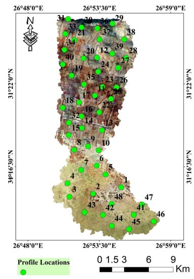 Forty-eight soil profiles were dug and distribution of them were depends on the identified geomorphic units of the investigated area (Figure 3). The depth of profiles is 150 cm or less relies on the hardpan presence. Soil profiles descriptions were done according to FAO [24]. Classification of soil profile was carried out according to USDA Soil Survey Staff [41]. The following chemical, physical, and biological properties of soil were determined: chemical analysis, i.e., salinity, soil reaction (pH), cation exchange capacity (CEC), and the exchangeable sodium percentage [42,43,44,45,46], physical properties, i.e., bulk density and the particle size distribution, hydraulic conductivity (HC) and water holding capacity (WHC) [47] and biological, i.e., soil organic matter content (OM%), available soil nitrogen (N), phosphorus (P), and potassium (K) [48,49]. Analysis was done in the accredited soil, water, and plant laboratory at Tanta University’s Faculty of Agriculture in accordance with ISO/IEC 17,025:2017 requirements.