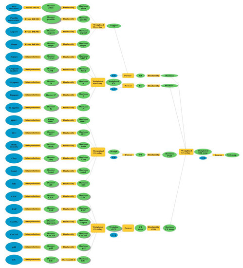 To produce the spatial model of SQ, the model builder function in ArcGIS 10.7 was used. This tool displays selected spatial analysis of parameters in a diagram chain [2] (Figure 4). Output of each process is used as the input to next process. The following stages were implemented in this work to obtain the final SQ map of the study area: (a) soil properties were interpolated from point based to raster layer; (b) the output from (a) reclassified into five classes (i.e., very high, high, moderate, low, and very low); (c) assigning score for each SQ parameter according to (Tables S1–S4) feeding Equations (7)–(11) using the raster calculator tool; and I the output from (d) used as input in weighted overlay function to produce and display the DSQM final map.