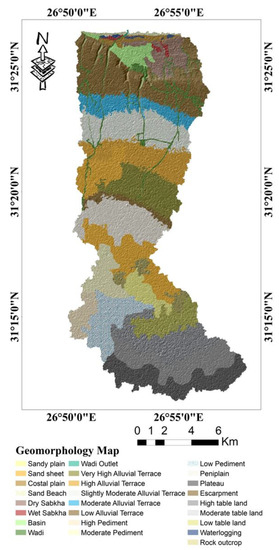 As shown in Table 2 and Figure 5 plains landscape includes five landforms’ units, i.e., sand sheet, sand plain, coastal plain, sand beach, and sabkha (wet and dry) with an area 1978.13, 462.27, 193.85, 113.70, and 705.73 hectares, respectively, it formed by erosion of the plateau. Soils of this unit are very important for agriculture due their flatness. Wadi unit consider one of the most diagnosed geomorphological units in the study area and extends in large areas of the north-western coast of Egypt [32] and occupying the north part of the study area. It receives high amounts of runoff in comparison to surrounding upland due to it is location in gentle slopes. This landscape covers about 733.05 hectare (3.34%) of total area including two landforms’ units (wadi and wadi outlet). Terraces units are formed by alluvial sediments cyclic erosion and deposition stages (cut and fill) in a setting that generates a staircase [76]. This unit classified into very high alluvial terraces (1227.42 ha), high alluvial terraces (1241.03 ha), slightly moderate alluvial terrace (1615.76 ha), moderate alluvial terrace (885.84 ha), and low alluvial terraces (2179.60 ha). Basins are defined as lowland where the accumulation of rainfall and drained water done on their outlet. Basins include both of the accumulative surface runoff, and nearby streams which, downslope towards the shared outlet represent 399.27 ha of total area. Pavement plain unit occupies 3588.68 ha (16.8%) of the total area and formed by the erosion processes over a long time. This unit is divided into Pediment plain (high, moderate and low with areas 444.14, 659.26 and 1054.62 hectares, respectively, and peneplain (1430.66 ha). The included landforms in the reference’s terms landscape are plateau (1444.62 ha), escarpment (774.97 ha), table land (3444.89), waterlogging, and rock outcrop (380.94 ha).