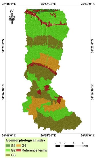 Geomorphologically, the GI values indicate that about 307.55 ha is located under very high class (G1) while around 9867 ha is high class (G2) and moderate geomorphology class (G3) cover 6919.26 ha of total study area and the poorest geomorphological conditions, i.e., low (G4) covers around 3045.7 ha due to the values of slope, aspect, plan, profile curvature show an accelerated, convergent surface runoff leads to hydric erosion (Figure S3a–d; Tables S5, S6, and Table 5 and Figure 6).