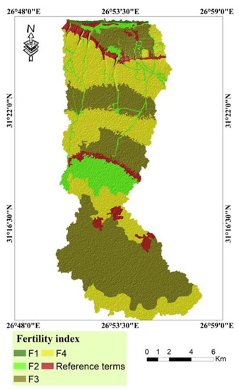 Soil fertility mapping is a key issue for a lot of implementations in research fields ranging from sustainability of soil management to the precision farming concept [67]. According to FI index, the study area fell into very high (F1), high (F2), moderate (F3), and low (F4) classes, respectively. A descending order of fertility index in the study area is F3 (9946.33 ha), F4 (7729.22 ha), F2 (2350.65 ha), and F1(113.70 ha) (Table 6 and Figure 7). As clear from results that most of study area located under F3 class because of deficiency of OM, N, P, and K values in addition low values of NDVI from remote sensing data over the study. NDVI is helping in achieving precision agriculture by predicting and mapping the land degradation extension and allowing farmers and decision makers to make accurate decisions on time [2,87]. The major causes of low productivity are soil fertility losing and nutrients depletion [88], so to achieve sustainable development, it requires decreasing losing and increasing the efficiency of use [89].