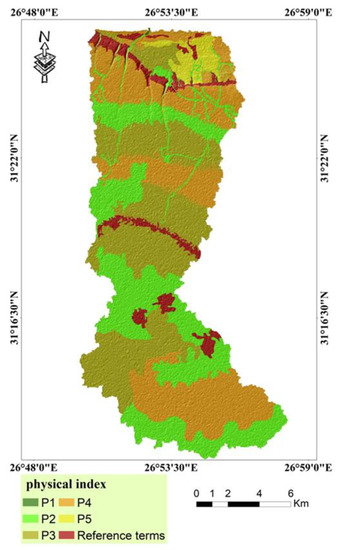 The data given in Table 7 and Figure 8 and indicate that PI in the study area is varied from very high physical index (P1) to very low (P5). Rating of soil physical index indicates that around 7 (ha) of study area is very high-quality soil due to deep soil profiles, low content of gravels, while 6457.6, 6634.14, 6409.43, and 331.80 (ha) of total agriculture areas are classified as high (P2), moderate (P3), low (P4), and very low (P5) classes, respectively. The soil limiting factors are coarse texture, high values of bulk density, and shallow depth.