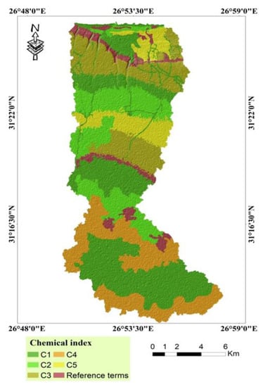 Soil degradation (chemical, physical, and biological), means reducing of soil quality [89]. Spatial distribution map of chemical index (Figure 9) shows that a wide range of chemical quality ranging from very low quality (C5) to very high (C1). The areas chemical index are as the follows: 7291.9 ha is very high quality, 3794.7 ha is high quality, 3407 ha is moderate quality, 3773.91 ha is low quality, and 1872.83 ha is very low. C1 class characterized by low values of ECe, ESP, and pH on the other hand, low values of CEC which may causing chemical degradation [90] and high content of CaCO3 are the main limiting factors of C5 class soils (Table 8).