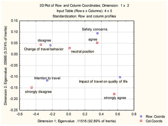 where rij are the elements of the row profiles matrix R and cj corresponds to the elements of the column loadings vector cT, which is equal to the mean column profile (centroid) of the column profiles in multidimensional space. The distance between the columns j and j′ is defined similarly; weights correspond to the elements of the row loadings vector r and sum over all rows. In correspondence analysis, we observe the relation between single categories of two categorical variables. This analysis results from the correspondence map introducing the axes of the reduced coordinates system, where single categories of both variables are displayed in graphic form. This analysis aims to reduce the multidimensional space of row and column profiles and save original data information as far as possible. Each row and column of the correspondence table can be displayed in a c-dimensional (or r-dimensional, respectively) space with coordinates equal to the values of the corresponding profiles. The row and column coordinates on each axis are scaled to have inertias equal to the principal inertia along that axis: the principal row and column coordinates [91,92].