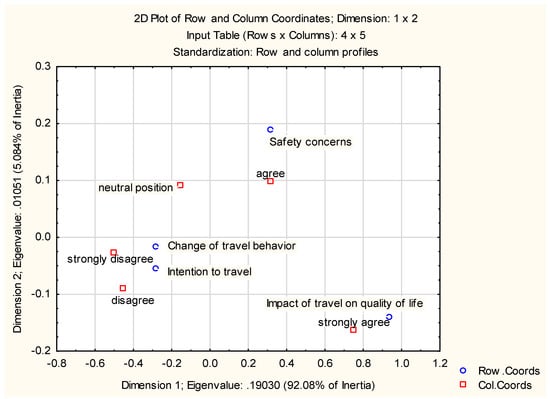 AVE and CR showed better construct values than the required 0.50 for AVE and 0.70 for CR [93]. Our results are identical to the findings of other studies around the world. Similar values were achieved by the study of Neuburger and Egger that conducted research in the DACH region, which comprises Germany, Austria, and Switzerland [71]. There are different studies about the acceptable values of Alpha, ranging from 0.70 to 0.95 [94,95]. However, we must note that some authors indicated that Alpha has a threshold or threshold value as an acceptable, sufficient, or satisfactory level. It was generally perceived as ≥0.70 (five instances) or >0.70 (three instances), although one article more vaguely referred to acceptable values of 0.70 or 0.60 [96,97]. In particular, the number of items tested, the relationship of the items, and the size affect the Alpha value [93]. A low value of Alpha could be due to a low number of questions, poor inter-relatedness between items, or heterogeneous constructs. In our study, the values of α = 0.65 (impact of travel on quality of life), α = 0.60 (intention to travel), and α = 0.68 (safety concerns) were found. We suppose that these values can be seen as acceptable because of the low number of items [98]. On the other hand, if the Alpha value is too high, some items are redundant as they test the same question but in a different guise. A maximum Alpha value of 0.90 has been recommended [99]. Our highest value of Alpha reached α = 0.79.