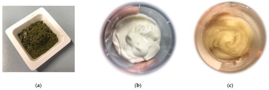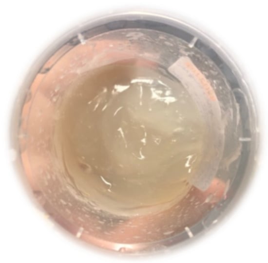 Briefly, we decided to exploit sodium alginate (A), pectin (Pe), and chitosan (Ch) as complementary natural biopolymers, investigating the most suitable ratio for a cosmetic formulation (Supplementary materials Table S1). Once a base with the desirable features was obtained, the next step was the addition of the Ulva lactuca (green algae) extract (Figure 2a). In particular, two different cosmetic formulations were prepared: a gel (Figure 2b, water dispersed in solid) and an emulsion Figure 2c (where the aqueous fraction is provided by the gel).