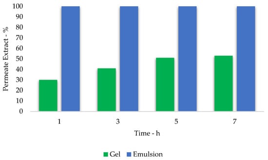 The observed trends are significantly different for gel and emulsion. Indeed, the first formulation allowed a controlled release of the actives, whilst the second led to an immediate permeation of all the extract after the first hour of testing. This phenomenon may be explained by a higher concentration of lipophilic compounds, more similar to the skin hydrolipidic film [,]. In addition, it can be assumed that, for the emulsion sample, the lipophilic fraction could lead to a partial collapse of the base polymeric network, which provides the controlled release.