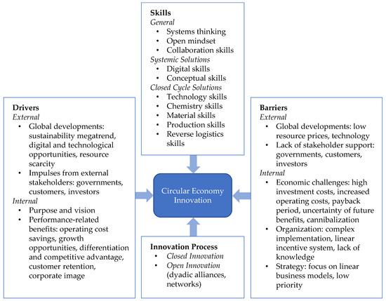 Conversely, the barriers for circular innovation come mainly from inside the company. The identified economic, strategic, and organizational barriers correspond with those in the existing research, e.g., [3,17,82]. However, various authors regard external barriers, such as technological restraints, unsupportive legislation, or a lack of consumer interest, as more important than the internal barriers [17,30,100]. This difference might be due to the fact that several CE studies combine macro, meso, and micro levels in their analyses. If the focus is not set on circular innovation but on a general transition toward the CE, external barriers carry more weight. A further factor influencing circular innovation is CE-related skills. This study reveals systems thinking, collaboration skills, and an open mindset as crucial to the development of circular solutions. However, these competencies are still not sufficiently available in companies. The literature confirms the high relevance of collaboration skills for circular design [28] but discusses systems thinking and an open mindset only in the context of CE implementation [3]. Furthermore, the empirical data point to an increased significance of digital and conceptual skills for systemic solutions, whereas closed cycle solutions mostly require strong technological and chemical knowledge. This distinction cannot be found in the literature.