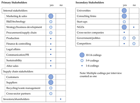 The following chapter focuses on relevant stakeholders for OCI. The findings suggest that involving different primary and secondary stakeholders [67] is crucial for the success of circular innovation. Figure 2 provides an overview of stakeholder groups and their significance for direct participation in OCI. Primary stakeholders comprise employees, supply chain stakeholders, cross-sector partners, and investors. The results reveal that inside the company employees from different departments should be part of the OCI process, especially those from marketing and sales but also those from R&D, strategy/business development, and the procurement/supply chain. Interviewee 10 explains: “Marketing and sales are very important, as they have to adopt another role and rethink completely. It is all about taking products back at the end of their life time or, even better, not selling products at all but only offering the service”. Further relevant departments include production, finance and controlling, sustainability, legal affairs, communication/PR, and after sales.