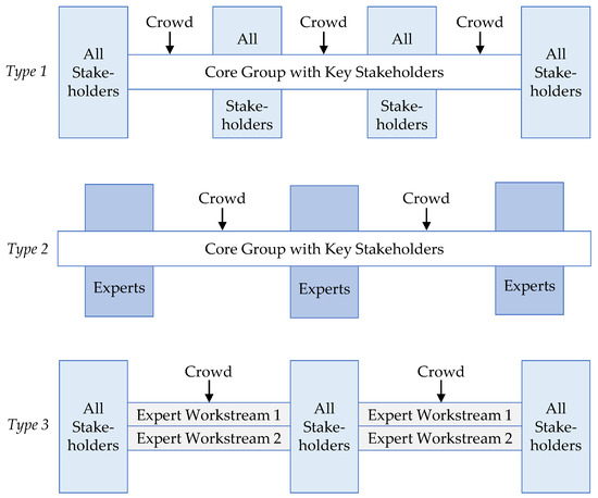 The process set-up which should be chosen to involve stakeholders in OCI depends on the specific project. Therefore, process concepts can be only proposed to a certain level of detail. Three main process types were identified in the data analysis (Figure 3). Type 1 is based on a core group that steers the process in an ongoing collaboration from beginning to end. It consists of the relevant internal stakeholders and the external key partners, such as customers, suppliers, start-ups, or universities. At certain points in the innovation process, a larger group of stakeholders is involved in online or offline workshops to discuss and challenge the project progress. “I would not integrate the other stakeholder groups directly to develop solutions but rather contact them repeatedly as a sounding board during the project. […] I would distinguish who is in the core team and who in the periphery. Both roles are important” (Interviewee 6). To answer particular questions along the innovation process, crowdsourcing can be applied with expert or consumer crowds. Process type 2 also includes ongoing core group and sporadic sessions with further stakeholders. However, the latter refer to collaborations with experts such as suppliers or consultants on a specific topic. “For battery design you can involve customers but for questions of battery recovery […] the customer is usually not so relevant. You have representatives of the whole supply chain on board. However, as this makes meetings quickly too large, you rather schedule case-related meetings with the stakeholder concerned” (Interviewee 4). Crowdsourcing with expert or consumer crowds can substitute or complement these expert collaborations, where appropriate.