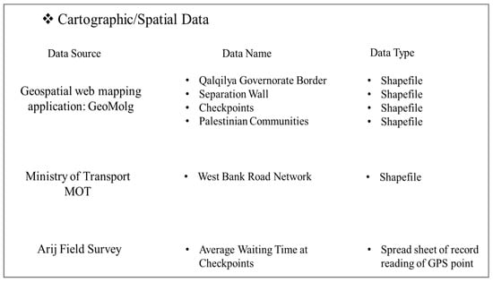 This research was based on data related to physical infrastructure, community mobility, and mobility restrictions. The collected data were integrated into a Geographic Information System (GIS) that provided a spatial illustration to support analysis of the mobility restrictions. Figure 1 summarizes the types and sources of data collected. Road network data were obtained from the last updated version of the 2018 geodatabase of the Palestinian ministry of transport (MOT). The data came in a shapefile with categories including road name, number, width, and type. Mobility restriction data, including the separation wall and checkpoints, were obtained from the Geospatial web mapping application of the ministry of local government (Geomolg) [17]. Geomolg is an open-source application that provides the ability to downloading the target layer in the form of a shapefile for any location.
